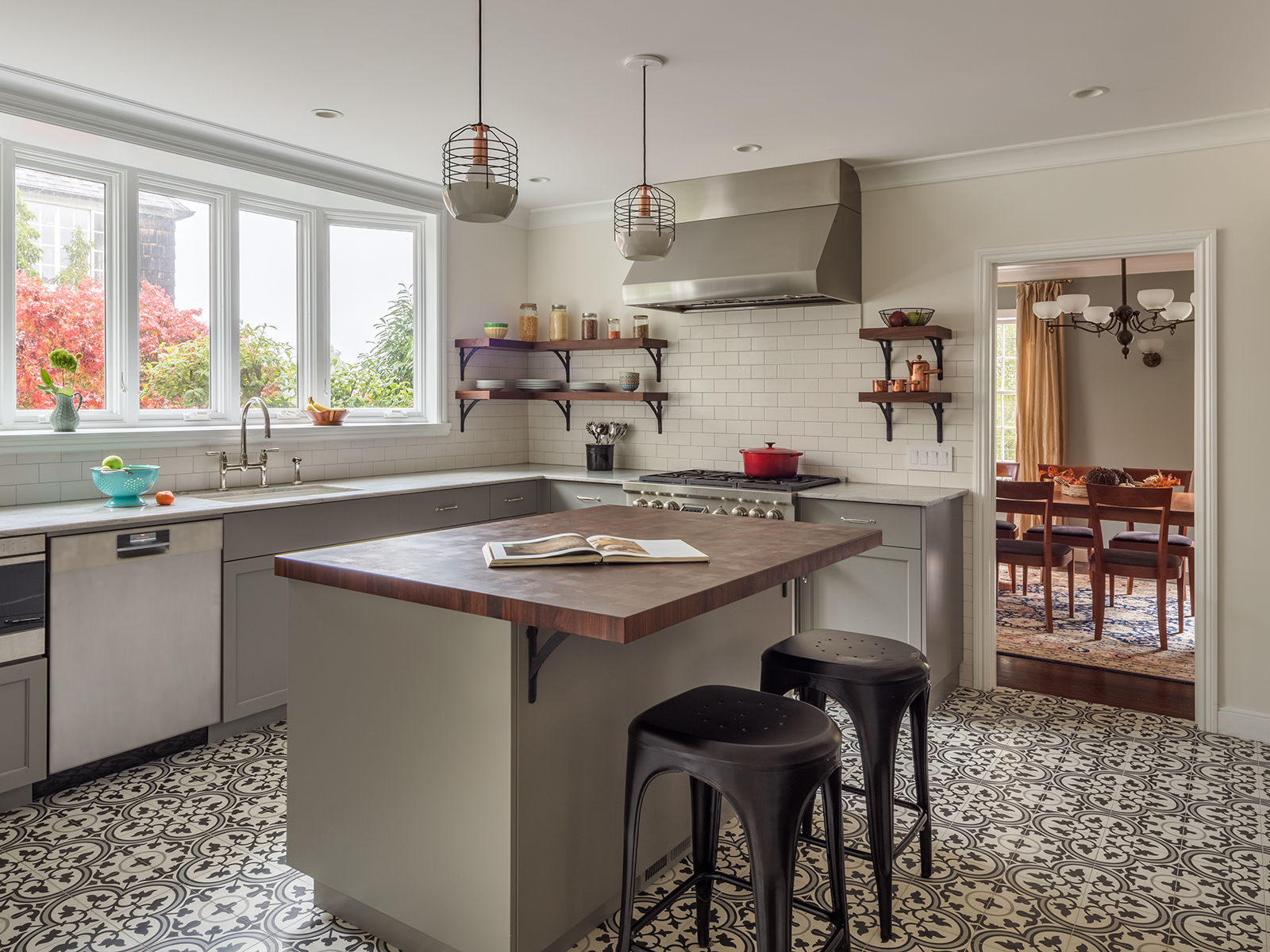 An interior remodel of a 1940’s French Eclectic home includes a new kitchen, breakfast, laundry, and three bathrooms featuring new cabinetry, fixtures, and patterned encaustic tile floors. Complementary in detail and substance to elements original to the house, these new spaces are stylistically remarkable, and accommodate the heavy use by our clients, their kids, and frequent guests. Other rooms, with somewhat “well-loved” woodwork, floors, and plaster are rejuvenated with deeply tinted custom finishes.